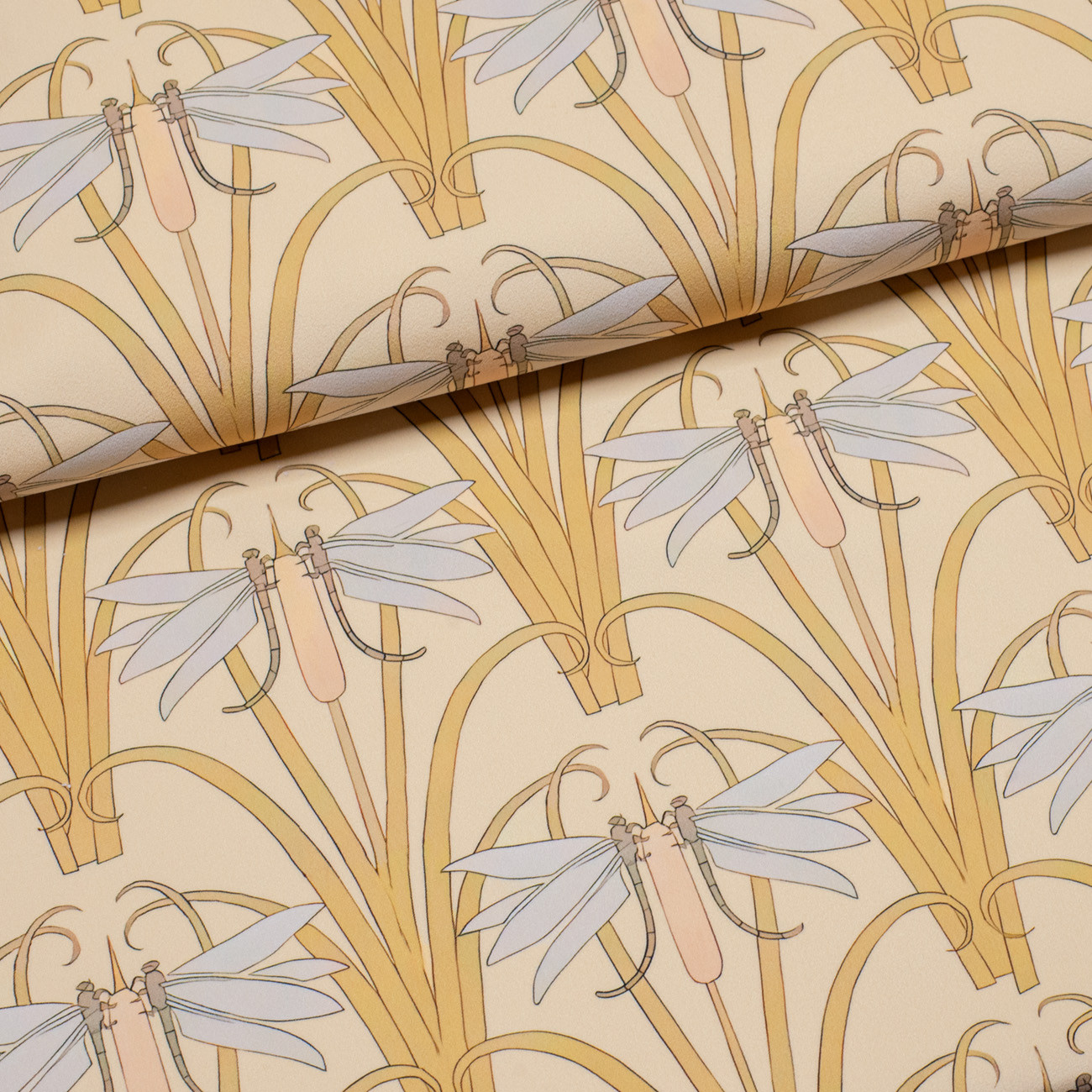 На нем изображены стилизованные стрекозы, симметрично расположенные среди вертикальных стеблей и изогнутых линий, характерных для этого направления.